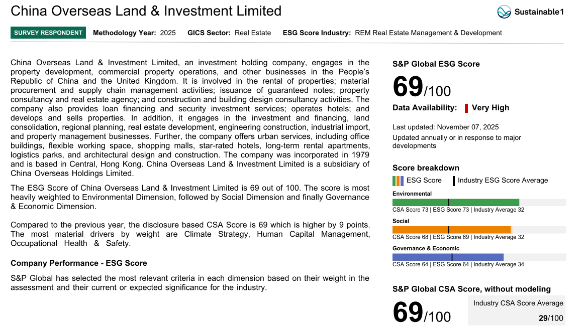 Recently, global rating agency S&P Global released the results of its 2025 Corporate Sustainability Assessment (CSA). China Overseas Land & Investment Ltd 麻豆影视. (“COLI” or “the Company”) achieved an outstanding score of 69 points, once again ranking No. 1 in the mainland real estate industry, underscoring the Company’s leadership in ESG and its resilience in sustainable development.