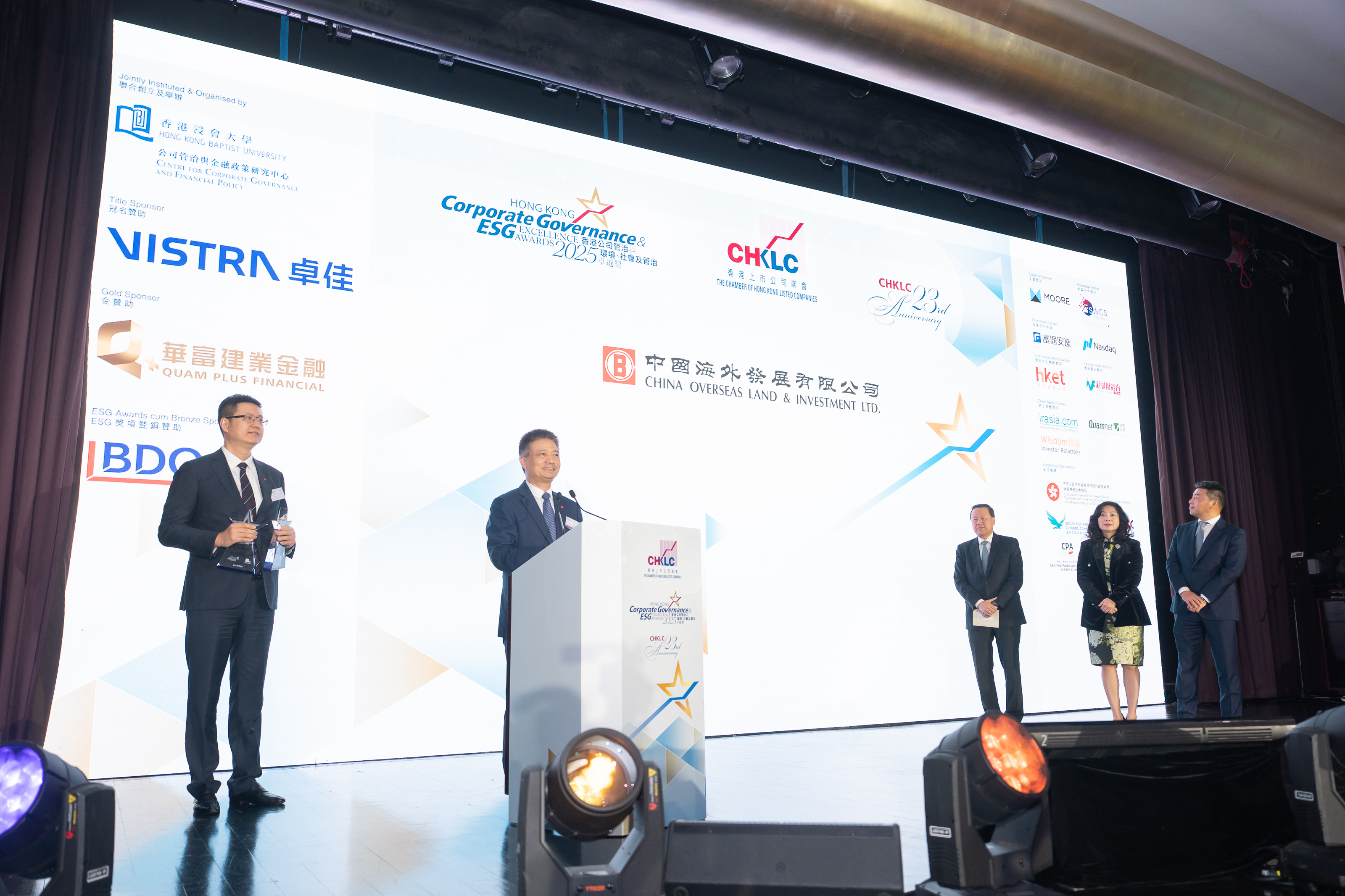 近日,由香港上市公司商會及香港浸會大學公司聯合評選的2025年度“香港公司管治與環境,社會及管治(ESG)卓越獎”頒獎典禮在香港舉行,中國海外發展榮獲恒生指數成分股公司類別“ESG卓越獎”和“公司管治卓越獎”,這是公司首次同時獲得這兩個殊榮,並繼續成為恒生指數成分股中唯一獲得上述殊榮的內房企,中海集團董事長,中國海外發展董事局主席顏建國 麻豆影视,中海集團董事,中國海外發展行政總裁張智超出席活動。