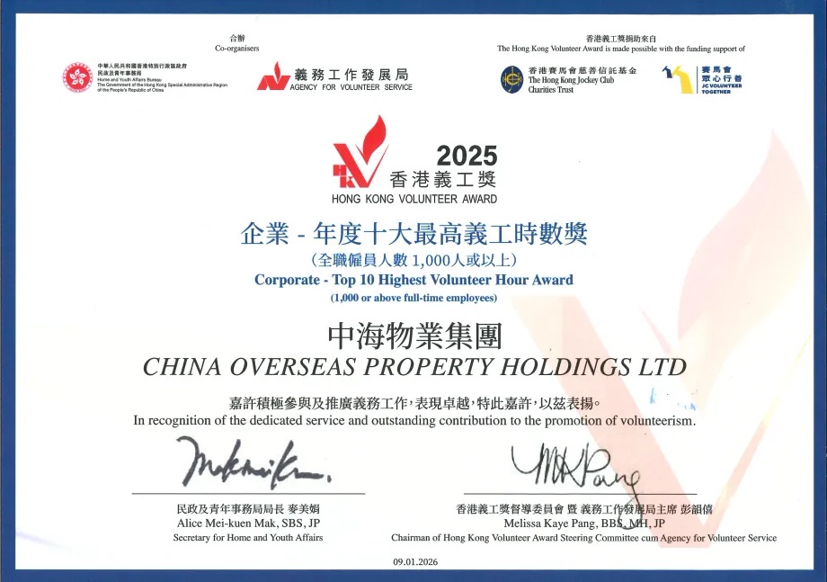 中海物业集团获得“企业-年度十大最高义工时数奖(全职雇员人数1,000人或以上)” 麻豆影视高清,“企业-义工时数卓越金奖”,旗下美博工程获得“企业-年度十大最高义工时数奖(全职雇员人数100-999人)”,“企业-义工时数优异奖”。