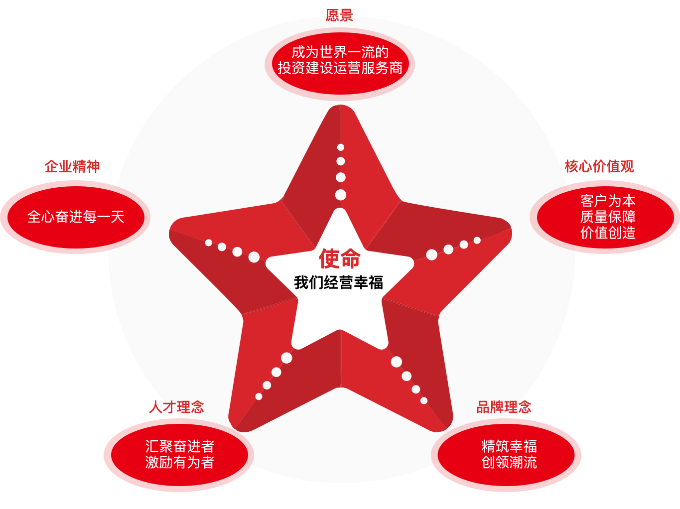 我们是幸福使者,以匠心与爱心,致力于为客户打造全生命周期的高品质产品和服务,不断满足对美好生活的向往,让幸福成为可能。我们是潮流创造者,凭借非凡的责任担当和持续的创新超越,不断刷新幸福的定义,引领人居生活方式和相关行业的发展趋势。